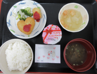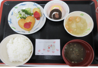 2月14日はバレンタインにちなんだお菓子やハート形コロッケを提供しました。